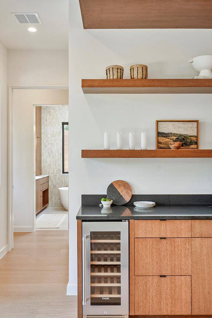 In a separate entertaining zone, a dedicated wet bar offers floating shelves, a built-in wine fridge, and sink. Ideal for hosting guests or enjoying an evening drink.