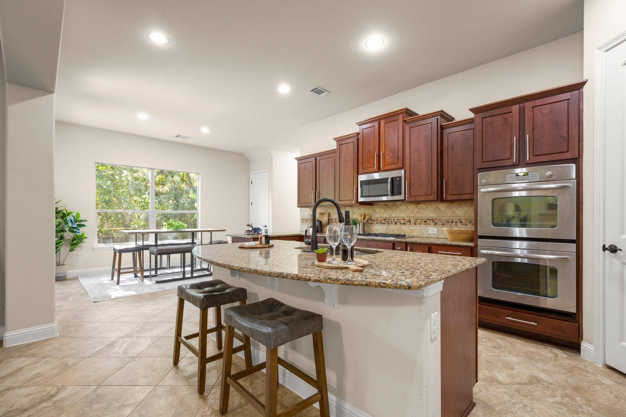 Step inside and fall in love with the bright, open floor plan framed by a wall of windows and graceful archways. The living room features a cozy gas fireplace and stunning views of the backyard. The chef's kitchen shines with granite counters, a large island, gas cooktop, double ovens, stainless appliances, and a sunny breakfast nook that opens to the covered patio—perfect for entertaining or relaxing outdoors.